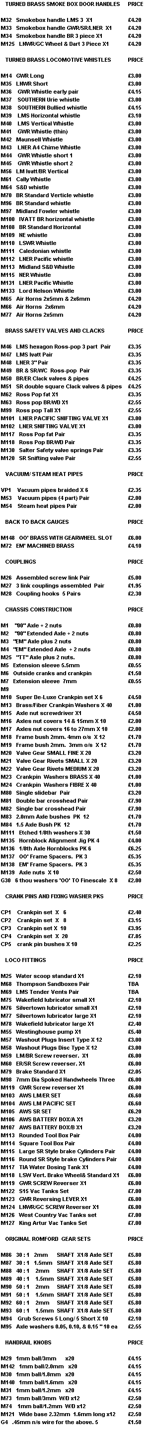 Loco detailing parts include: Whistle, darts, safety valves, crank pins, bearings, couplings, a selection of cast white metal parts.